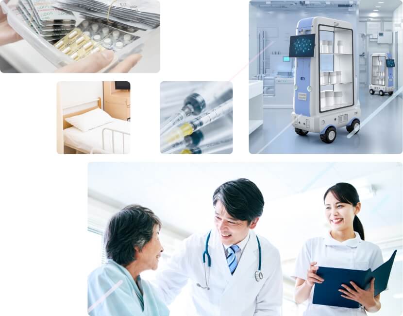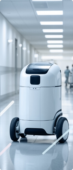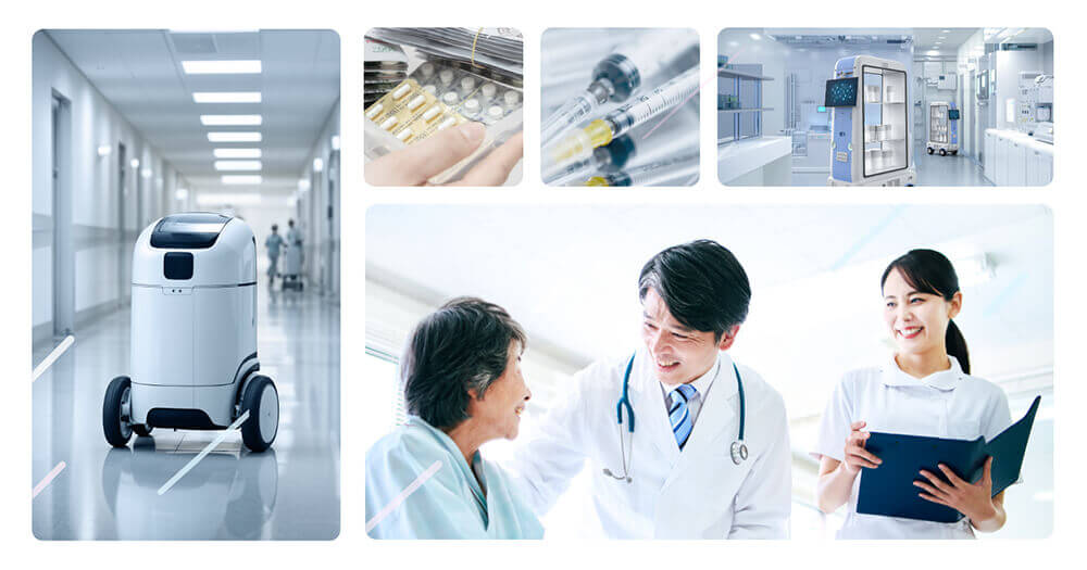 病院内の薬剤・検体・リネン・配膳ワゴンなどの搬送業務をロボットが自動で行う「病院搬送ロボット」。看護師やコメディカルの移動・運搬の負担を減らし、患者ケアに専念できる環境づくりに貢献します。人手不足への対応、ヒューマンエラーの抑制、感染対策の強化、24時間体制での効率的な院内物流など、医療現場を支える多くのメリットが注目されています。